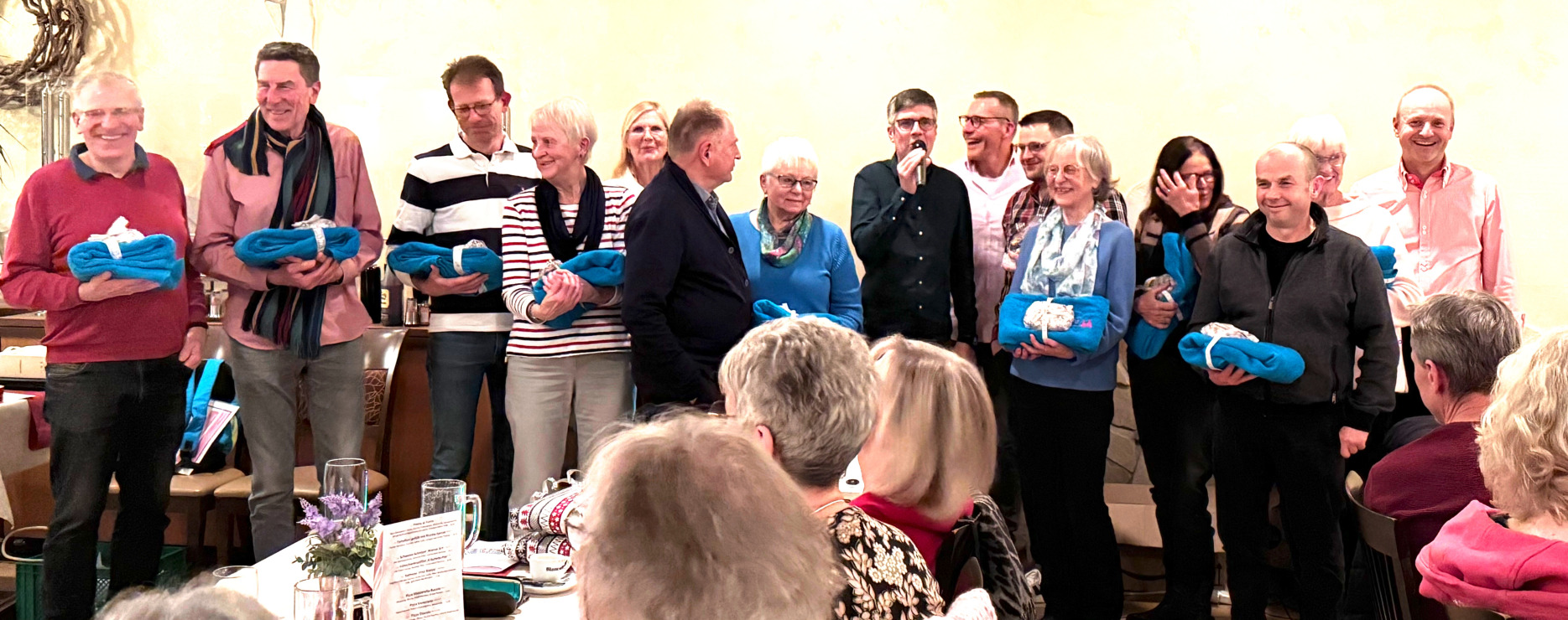 Nach der Essenspause übernahm Gutzeit erneut das Wort. Zunächst gratulierte Gutzeit nochmals Marianne Müller-Sidow zu Ihrem 20. Jährigen Jubiläum als Laufgruppenleiterin der Nordic Walking Gruppe. Diese wurde seinerzeit durch Müller-Sidow ins Leben gerufen und ist ein Motor des Lauftreffs. Weiterhin bedankte sich Gutzeit bei allen Gruppenleiter:innen für Ihre unermüdliche Arbeit und Unterstützung – jeden Mittwoch und Sonntag im Wald, als auch bei allen anderen zuvor genannten Aktivitäten, ob sichtbar oder eher im Hintergrund. Hierzu rief er jede Person einzeln auf und überreichte Badetücher mit dem 50 Jahre Jubiläumslogo des Lauftreff Gelnhausen. Nachdem der offizielle Teil beendet war, gingen die Anwesenden dann in den gemütlichen Teil des Abends über, genossen angeregte Gespräche, bevor der Abend dann langsam ausklang.