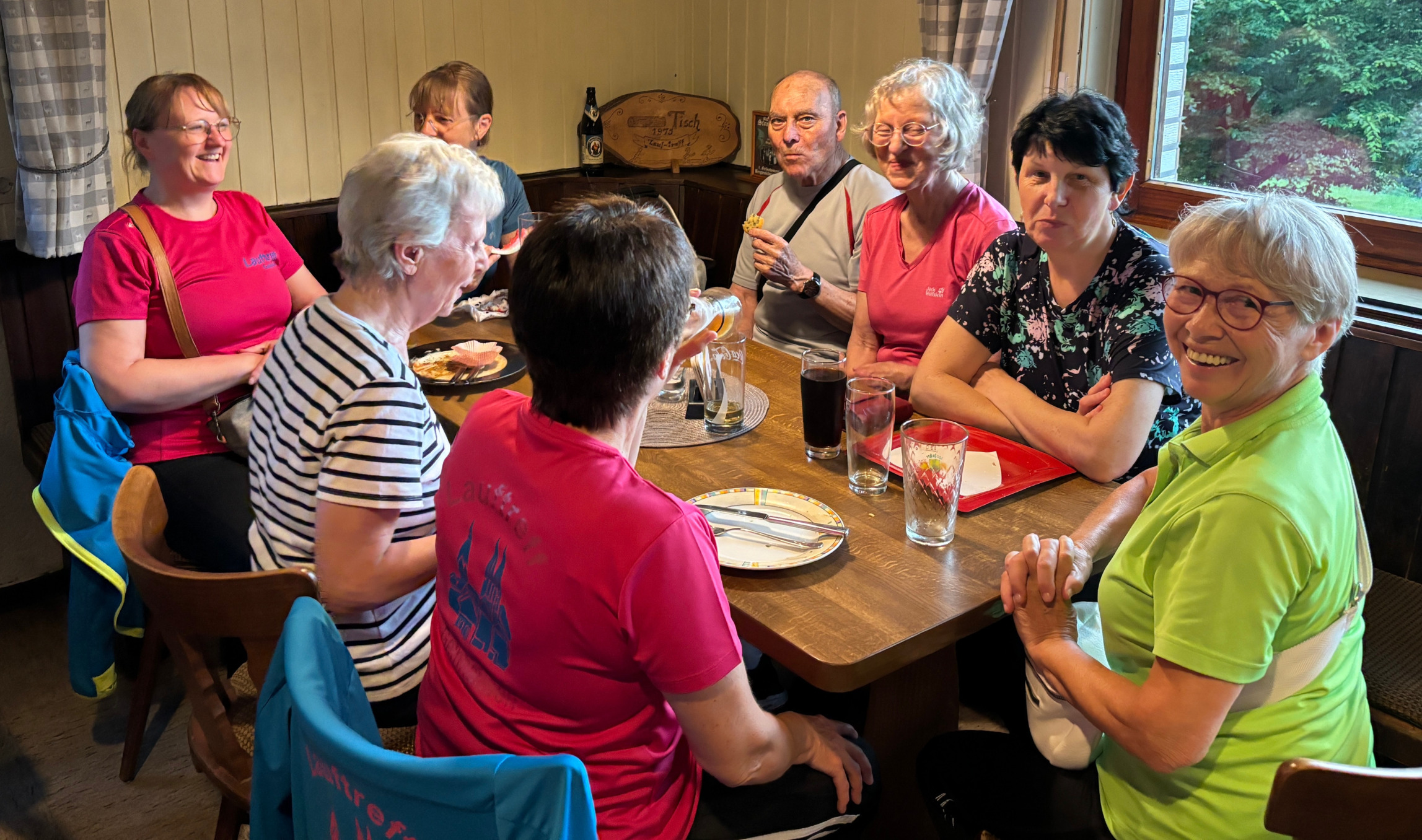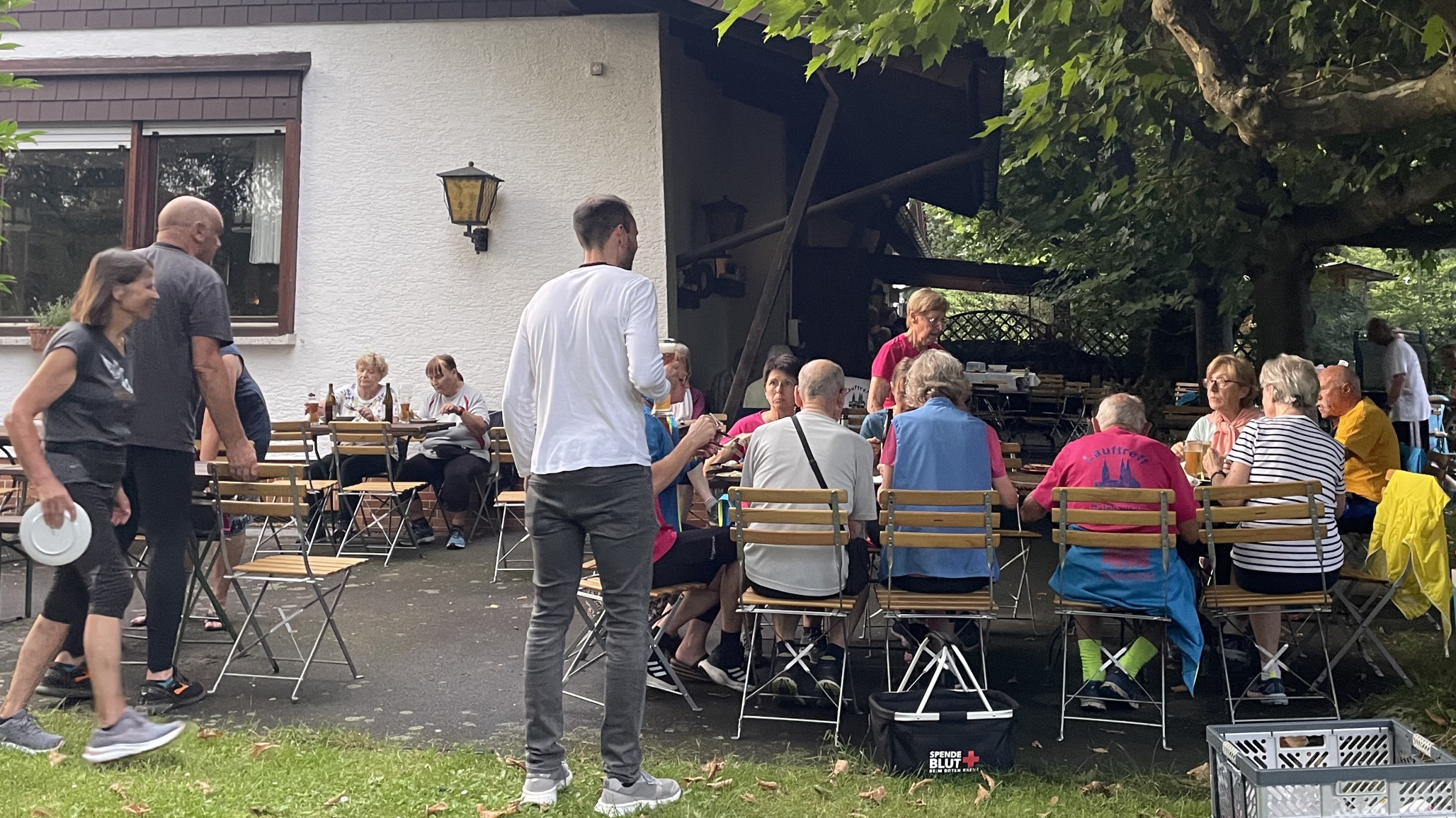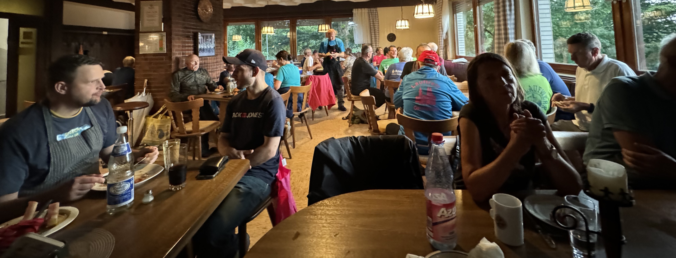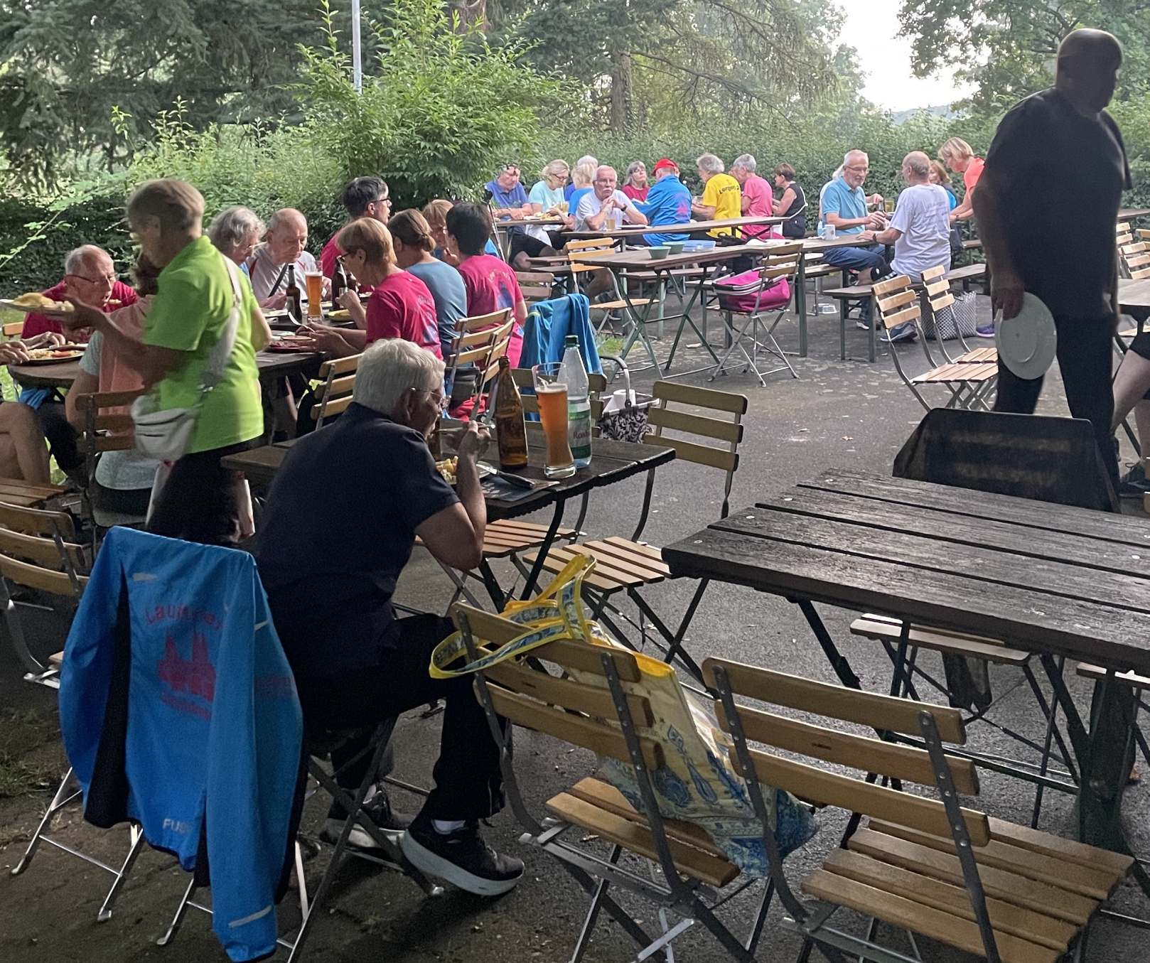 Doch dann zog es sich zu … Aus ein paar kleinen Regentropfen wurde mehr, es regnete heftig und die rund 70 Teilnehmer:innen retten sich und ihr Essen aus dem Gartenbereich in den Innenraum der Gaststätte. Hier, im Trockenen, ging die Feier dann ausgelassen weiter.