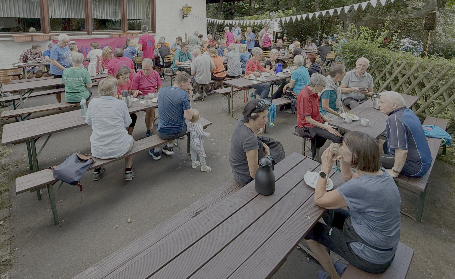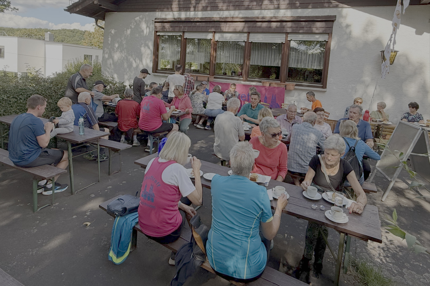 Geselliges Beisammensein nach dem Kuchenlauf im Biergarten des Blockhauses